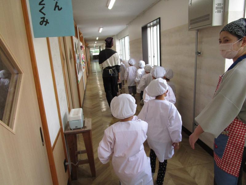 野菜を切るなどの作業中の給食室ものぞかせてもらいました。大きな鍋などがあり、興味津々でますます給食が楽しみになりましたね。