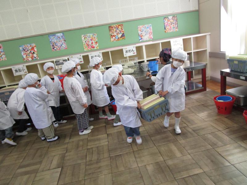 1年生は、明日から始まる給食に向けて、準備から片付けまでの給食練習をしました。明日からの給食を楽しみにわくわくしながら、一生懸命取り組みました。