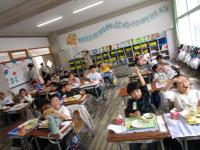 4年生は担任の先生とALTの先生と外国語を学習していました。ALTの先生クイズでは、先生の出身の国・好きな色を真剣に考えましたが、なかなか当たりません。正解でなくても、ALTの先生は「Nice try!」と笑顔で声をかけてくれ、みんな果敢に挙手しました。