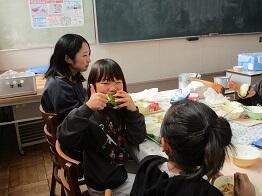 児童たちは、給食時間にわざわざクラスまで来てくれたお姉さんたちの話を一生懸命聴いていました。