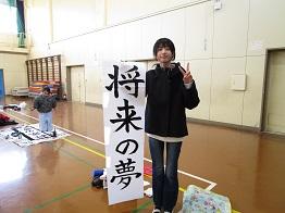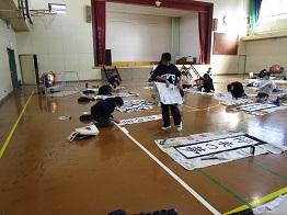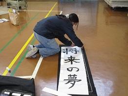 「将来の夢」という新年にふさわしい言葉を、大筆で一文字一文字丁寧に書いていく児童たちです。