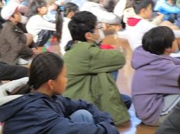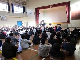 全校児童が体育館に参集する中、とても静かに立派な態度で話を聴く児童たちです。