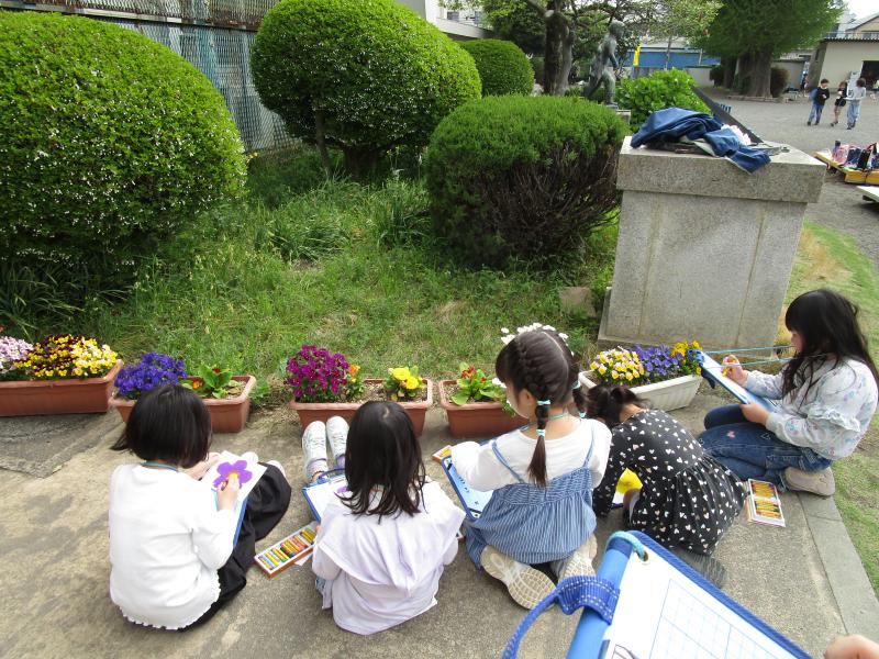 校庭では、春の植物を見つけて、絵を描いていました。ぽかぽかと暖かい日に、素敵な花の絵が仕上がっていきました。「校長先生、こんにちはー!」と元気に声をかけてくれました。