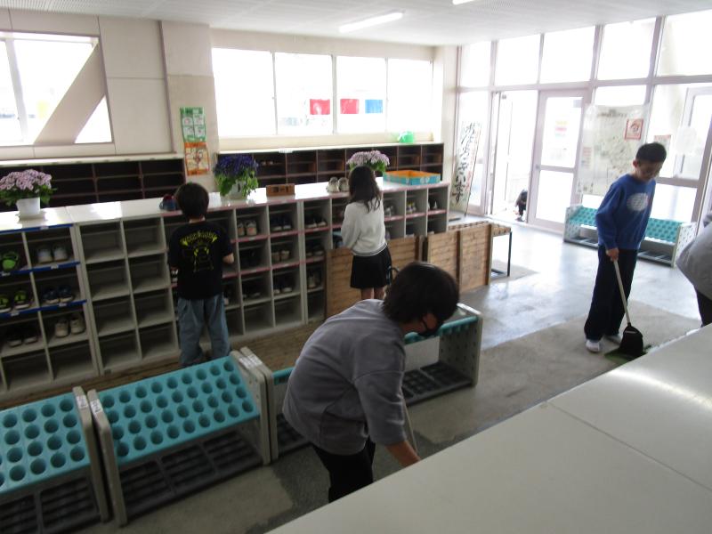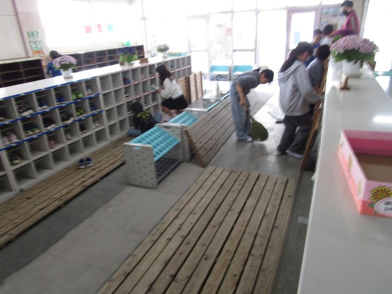 掃除も始まり、あちこちで一生懸命掃除をする姿がありました。昇降口では、靴箱を小さいほうきで丁寧に掃いたり、すのこを持ち上げて隅々まで掃いたりしてくれました。