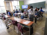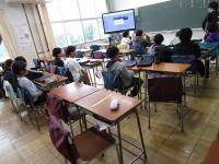 4年生は担任の先生とALTの先生と外国語を学習していました。ALTの先生クイズでは、先生の出身の国・好きな色を真剣に考えましたが、なかなか当たりません。正解でなくても、ALTの先生は「Nice try!」と笑顔で声をかけてくれ、みんな果敢に挙手しました。