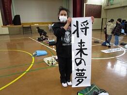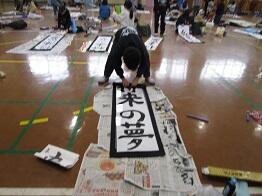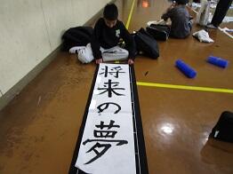 「将来の夢」という新年にふさわしい言葉を、大筆で一文字一文字丁寧に書いていく児童たちです。