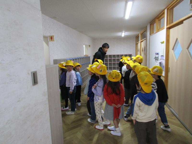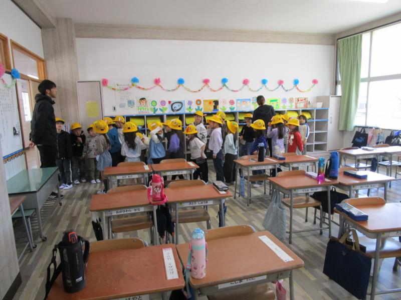 教室では・・・朝の支度の仕方、校歌の練習、トイレの使い方などいろいろな勉強をしました。ランドセルのしまい方では、先生が悪い例を示すと、「ううん、だめだよ!奥まで入れないと。」「通る人にぶつかっちゃうよ。」とよく考えて声を上げていました。