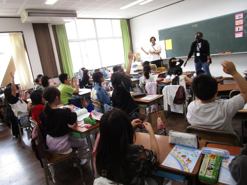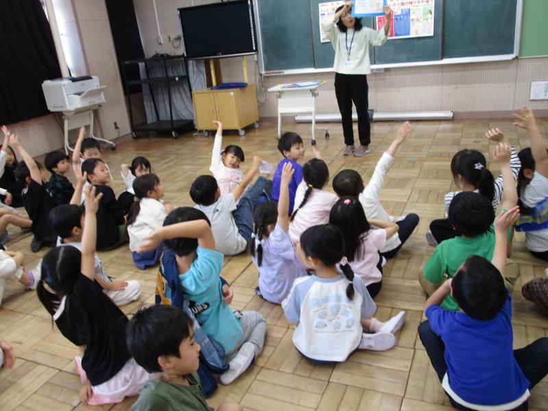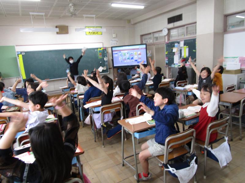 4年生は担任の先生とALTの先生と外国語を学習していました。ALTの先生クイズでは、先生の出身の国・好きな色を真剣に考えましたが、なかなか当たりません。正解でなくても、ALTの先生は「Nice try!」と笑顔で声をかけてくれ、みんな果敢に挙手しました。