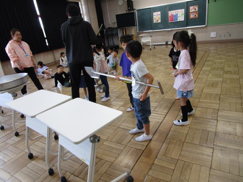 そして、給食室で使う大きな道具を持たせてもらいました。