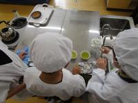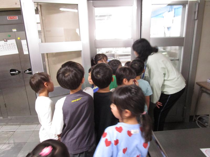 野菜を切るなどの作業中の給食室ものぞかせてもらいました。大きな鍋などがあり、興味津々でますます給食が楽しみになりましたね。