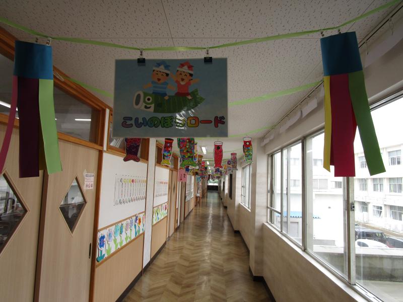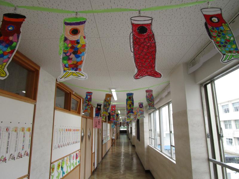 こいのぼりロード!今、1年生の教室前廊下の天井には、1年生が作ったこいのぼりが泳いでいます。好きな色で塗った元気いっぱいのこいのぼりです。