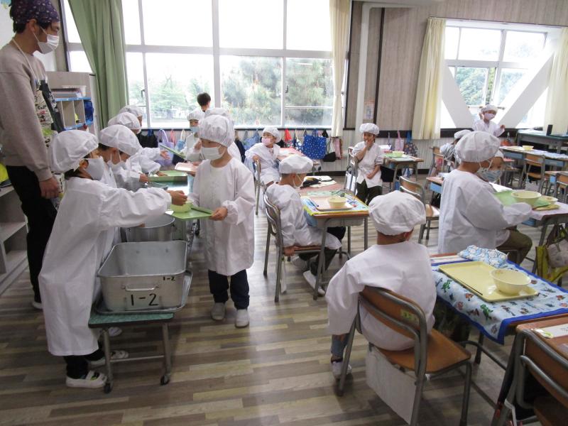 1年生は、明日から始まる給食に向けて、準備から片付けまでの給食練習をしました。明日からの給食を楽しみにわくわくしながら、一生懸命取り組みました。