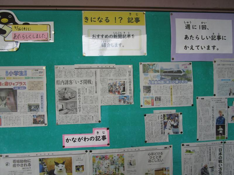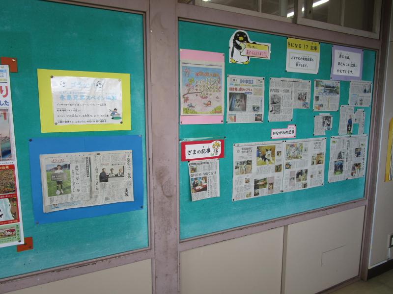 図書室の廊下壁面には、学校図書館司書さんが掲示を工夫してくれています。つい足を止めて読みたくなる記事がたくさんあります。子どもたちも、まずは気になる記事から読んでほしいなあと思います。
